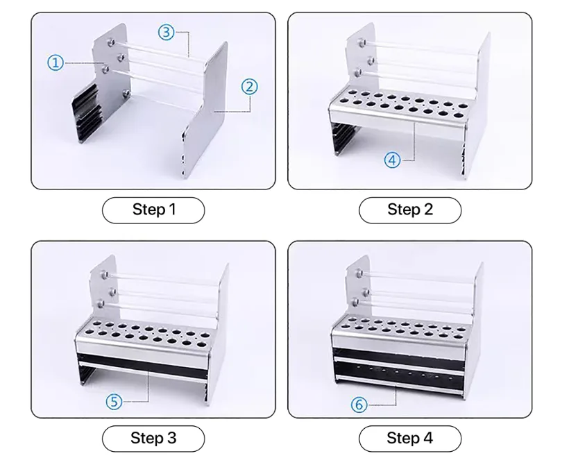 Tiene 4 pilares que pueden colgar alambre de estaño, alicates, etc.