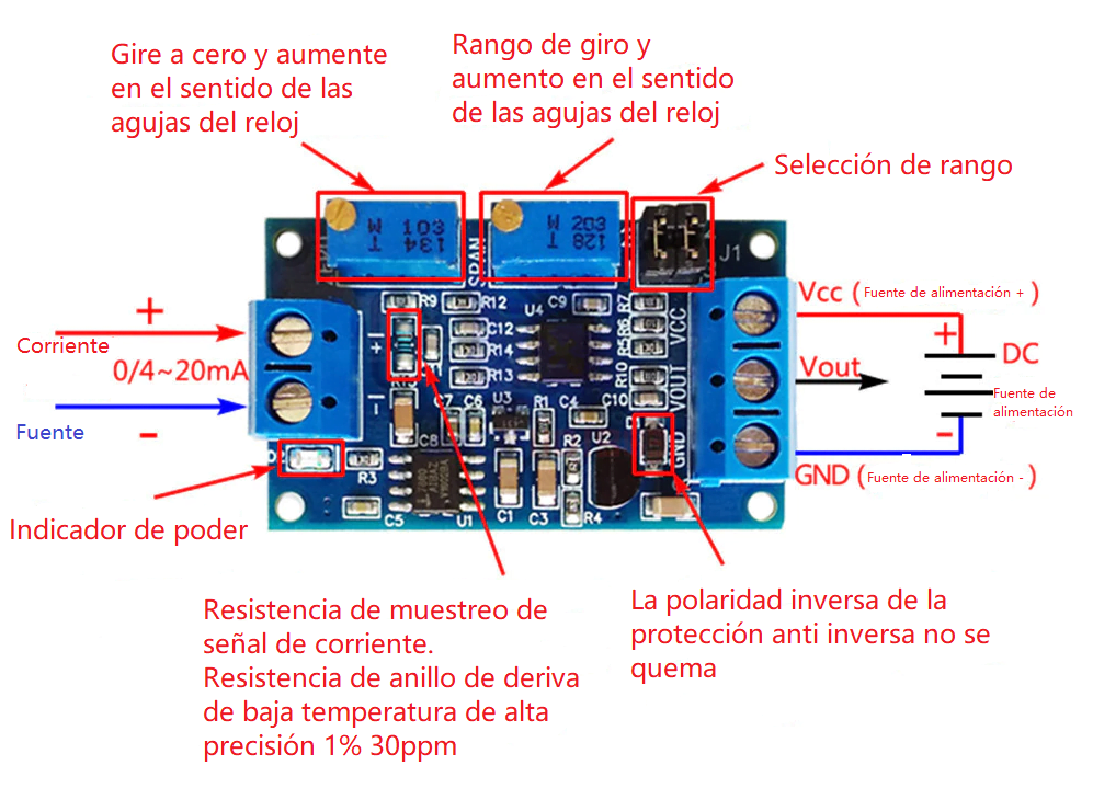 3. Cuando la entrada de corriente es mínima (0mA o 4mA), ajuste el potenciómetro a CERO, de modo que la salida de VOUT sea mínima (0,0 V u otro voltaje)